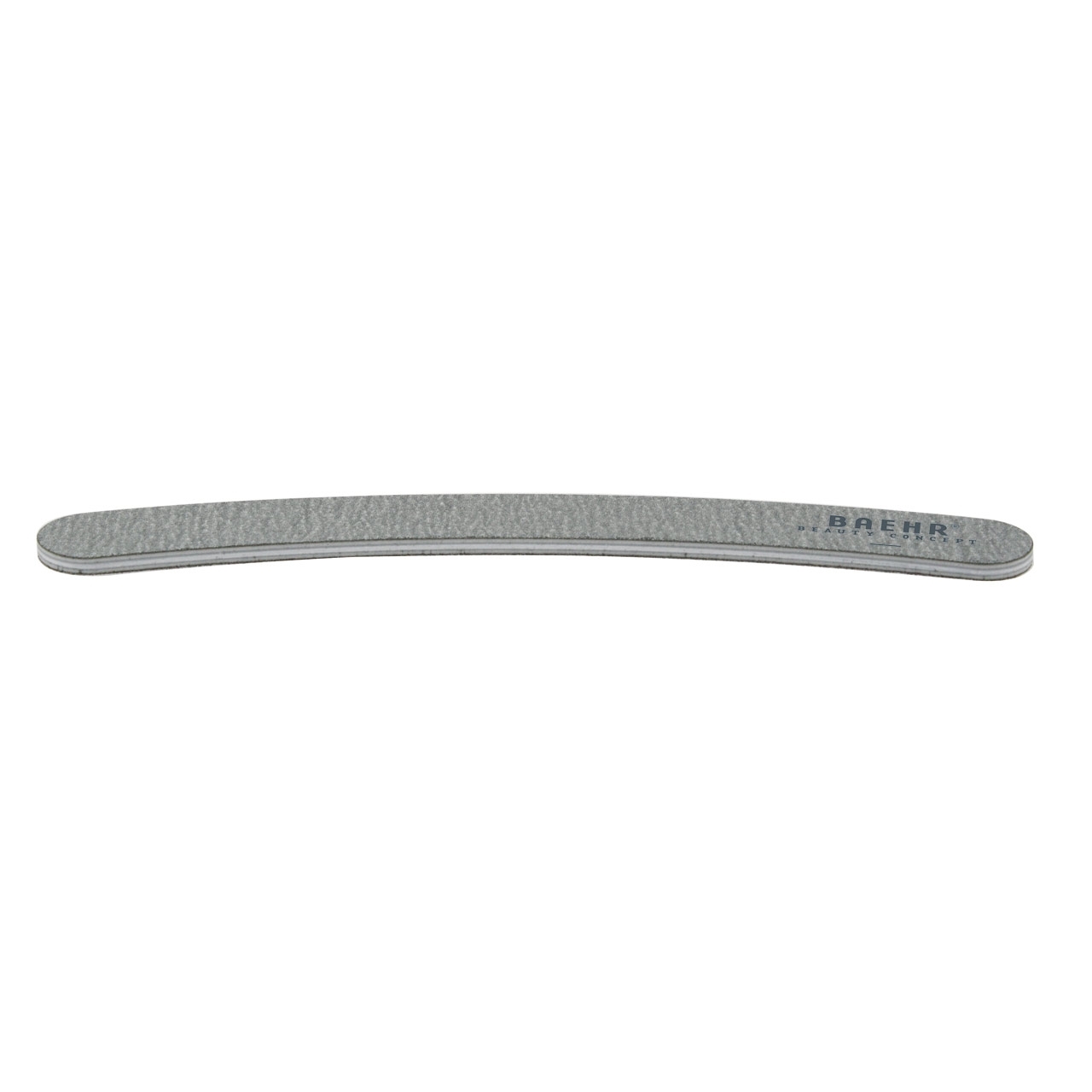 Die BAEHR Profifeile "ZEBRA" ist in einer ansprechenden grauen Farbe gehalten und mit dem markanten BAEHR-Logo versehen. Ihre Bananenform ermöglicht ein präzises Arbeiten und erreicht auch schwer zugängliche Stellen mit Leichtigkeit. Die Feile ist beidseitig nutzbar, mit einer groben Seite für das Formen und einer feineren Seite für das Glätten der Nägel. Die Körnung von 100/180 macht sie zu einem vielseitigen Werkzeug für die Nagelpflege.